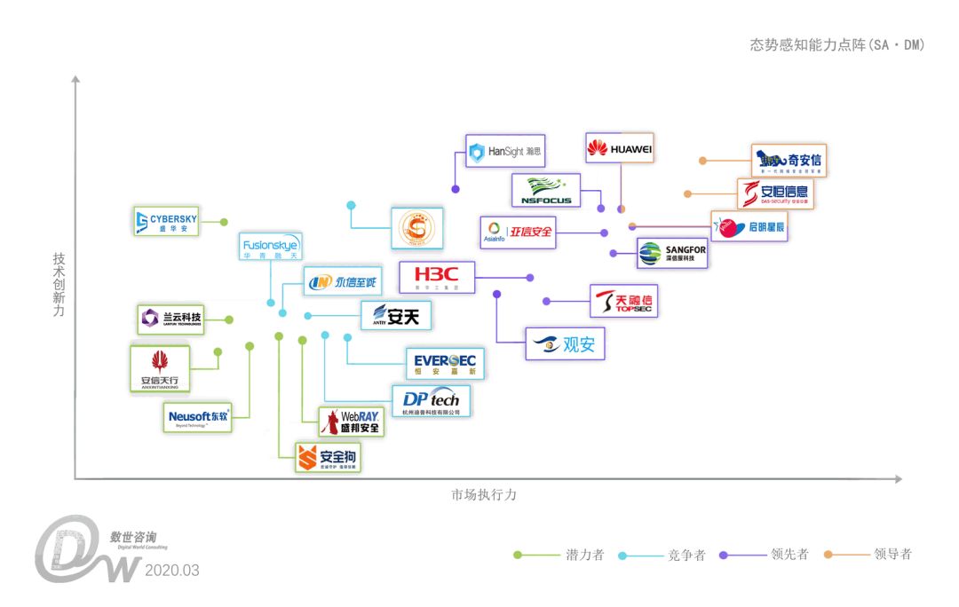 本次参与态势感知调研的安全厂商共38家,入选态势感知能力点阵的安全厂商有23家,分别为: 兰云科技、安信天行、安全狗、盛华安、盛邦安全、华青融天、永信至诚、东软、迪普科技、PCSA行业云联盟、安天、恒安嘉新、观安信息、瀚思科技、新华三、天融信、启明星辰、安恒信息、奇安信、华为、绿盟科技、亚信安全、深信服。未入选的15家厂商,因态势感知系统更偏向于某一细分技术,或者通用的网络与信息系统场景,如移动态势感知、工业态势感知、数据态势感知等。还有一些厂商的态势感知体系与本报告所定义的“态势感知”概念不符,因此未能进入本次态势感知能力点阵图。