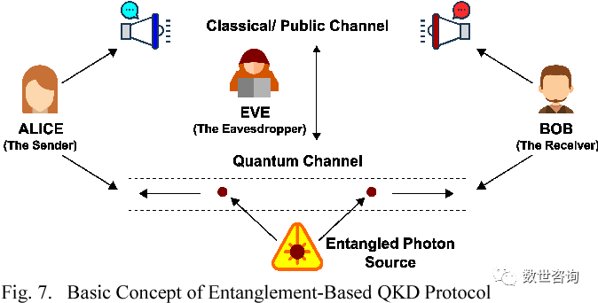 与基于数学原理的后量子密码技术不同,量子密钥分发(QKD)来源于物理原理,利用亚原子粒子的量子纠缠现象,生成真正的一次一密的随机数,并杜绝了窃听者在不被发现地情况下截获密钥的可能,至少在理论上完全杜绝了中间人攻击。