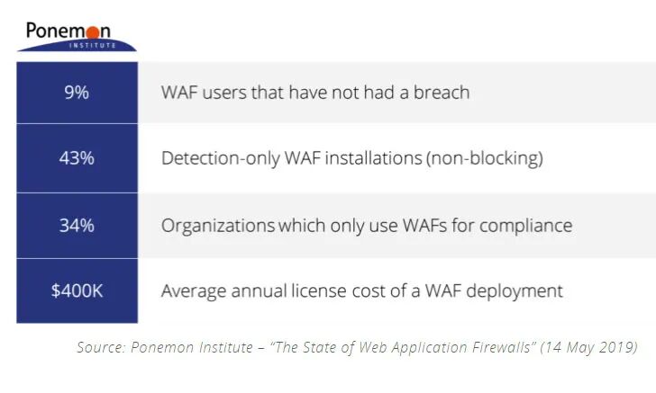 波耐蒙研究所的调查研究显示,65%的公司企业经历过WAF失效,仅9%的公司企业WAF未遭突破。然而,这并不代表他们的WAF在未来永远不会被绕过。公司企业担心自身WAF的性能和安全不无道理。