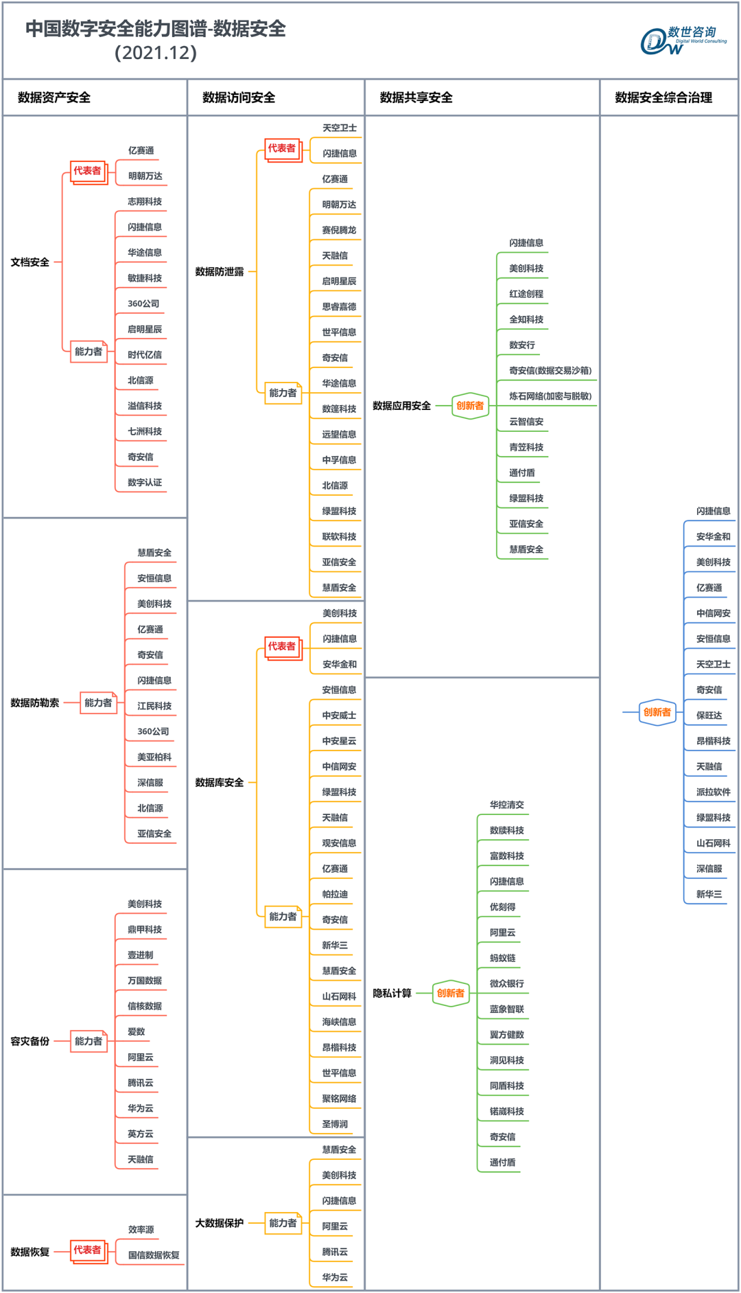 能力图谱是基于数世咨询创始成员于2016年9月业界首发的“全景图”品牌更新迭代而来,逻辑框架由IPDRR演进到现在的三元论,分类由技术产品演进到现在的安全能力,安全企业由“企业大全”演进到现在的“企业精选”,同时将“数据安全”从子领域上升到第八大方向,与“网络安全”的七大方向并行,形成“数字安全”的统一概念。