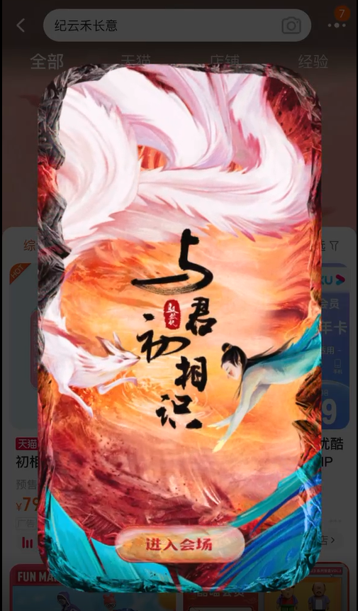 另一方面,通过淘宝搜索+天猫虚拟业务的合作,在淘宝平台推出了“纪云禾长意”的搜索彩蛋,当观众在搜索框输入主演的名字,便会在一小段动画后进入会员与周边界面;同时还开展了“纪云禾购物车”等话题活动,通过分享角色的“购物车”,让形象更加立体充实,仿佛角色就在眼前向我们进行好物介绍。