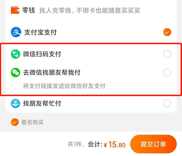 相较于之前的支付方式,新版淘宝 App在订单提交页面,展示了“微信扫码支付”和“去微信找朋友帮我付”这两种方式。