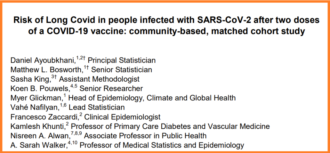 Risk of Long Covid in people infected with SARS-CoV-2 after two doses of a COVID-19 vaccine: community-based, matched cohort study Daniel Ayoubkhani et al,
