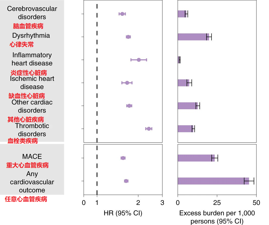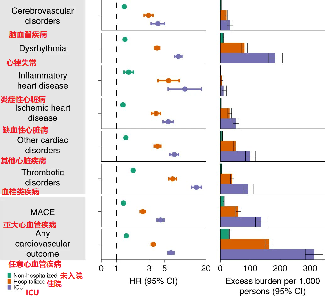 上述发病风险和疾病负担的大小,和病毒急性感染期的疾病分型(无需入院、住院或ICU)有相关性。我们的研究结果表明,新冠病毒感染症康复病例有显著的心血管疾病发病风险和疾病负担,因此亟需关注这些康复病例的心血管健康。