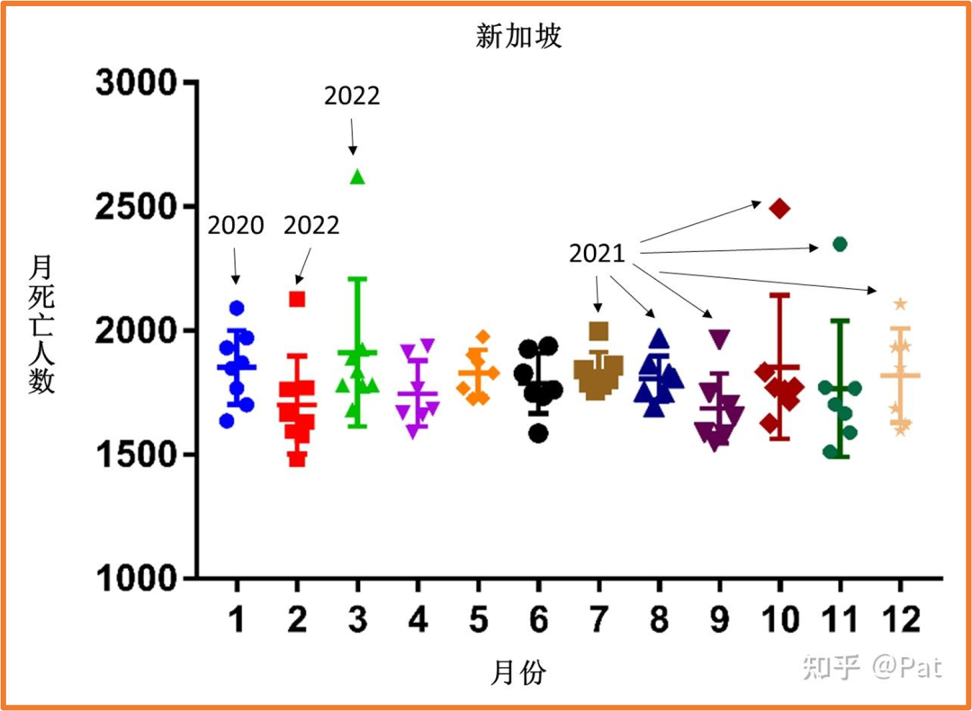 这样列出来,如2022年3月和2021年10月这种超高奇异值,没有人可以否认存在超额死亡吧。