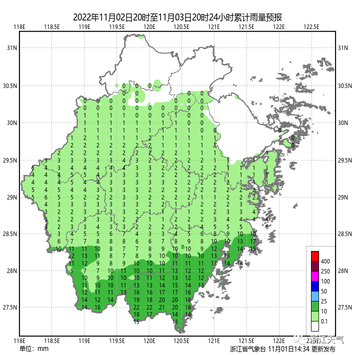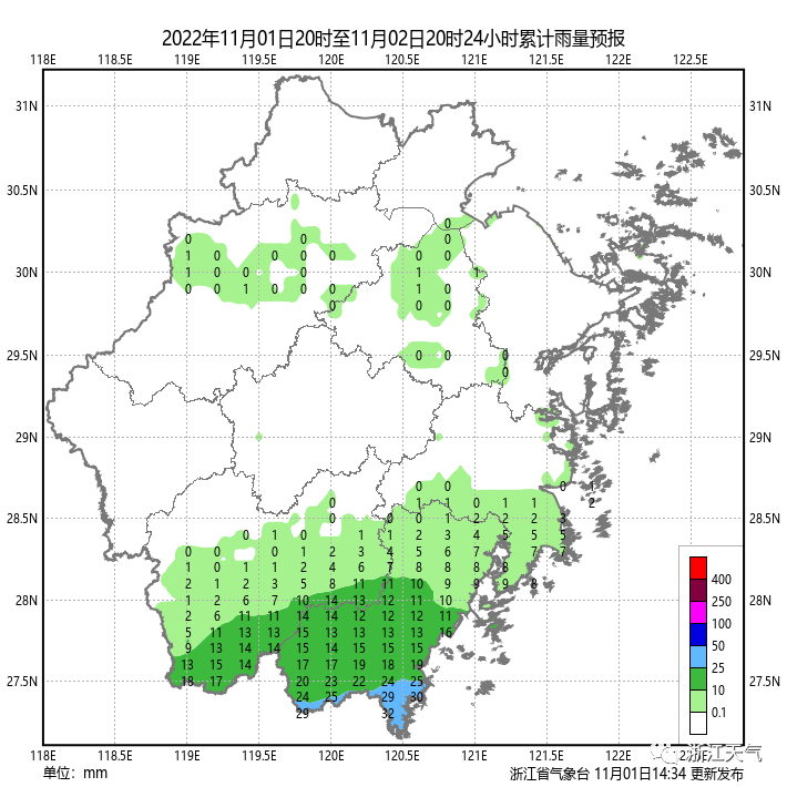 降水预报:11月1日20时至2日20时,台湾岛东北部、福建中部、广东南部及沿海等地的部分地区将有大到暴雨,其中广东南部沿海局地有大暴雨(100-120毫米)。