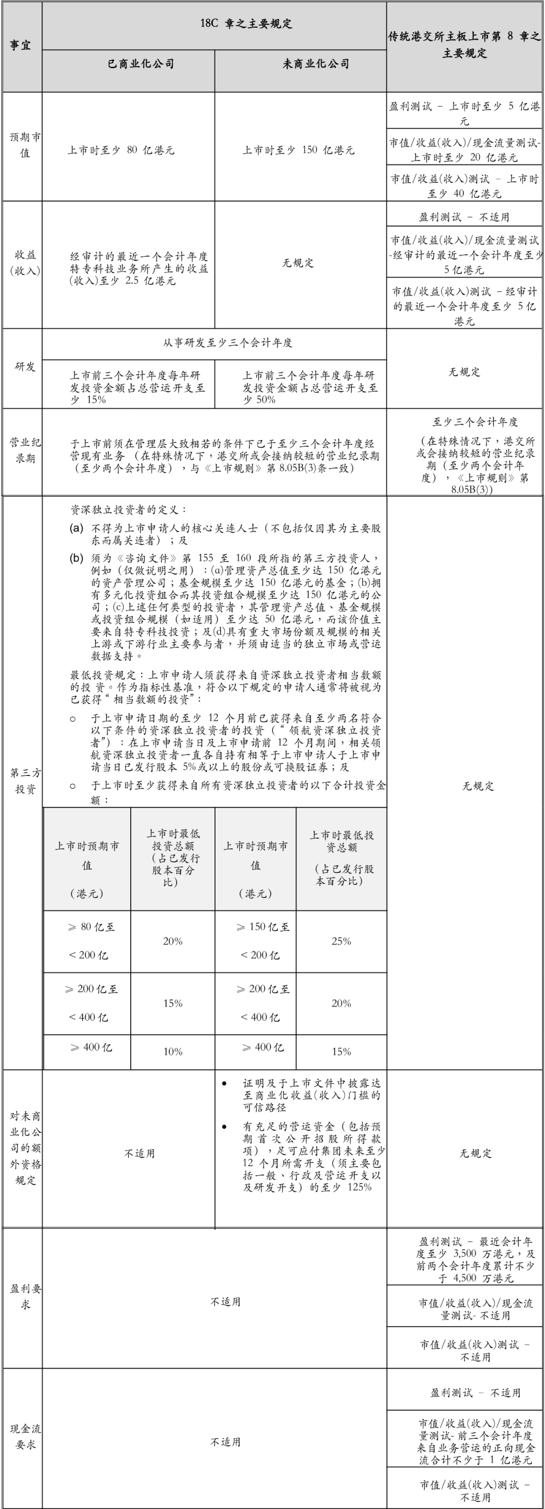 18C章对上市发行人的预期市值80亿港币(已商业化公司)和150亿港币(未商业化公司)要求高于科创板(除红筹企业外,10亿-40亿元人民币),同时,18C章看重上市发行人历史融资情况。