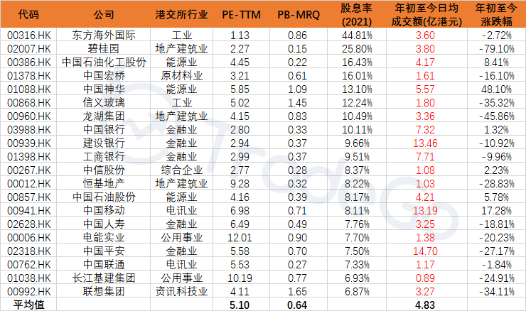 港股目前整体估值确实处于历史极低位,但主要受到疫情、油价、利率、行业权重等多重因素影响。尤其是恒生指数四成权重股由低估值的金融、地产股构成。要知道,恒生指数仅有73只成份股,总市值212,035.24亿港元;其中金融股就有11只(银行7+非银4),总市值66,374.08亿港元,成分权重34.02%;房地产股也有11只,总市值12580.56亿港元,成分权重6%,若加上另外的领展房产基金则成分权重达7.11%。金融、地产股占了恒指的权重的40%以上,而这两者在全世界范围内都是典型的低估值类型,不受市场青睐。港股特殊的成分股构成比例导致整体估值很低,但这只是“结构性低估”。另外,港股共有超过2600家上市公司,73只成份股对整个市场的“代表性”确实不够充分。另一方面,股息率是投资者判断上市公司长期投资价值的重要指标,若股息率超过1年期银行存款利率,则这只股票基本可以视为收益型股票,股息率越高越吸引人。然而,恒指成分股中股息率排名前20的个股普遍都存在流动性低的问题,许多看似估值便宜又分红诱人的蓝筹股实际上交易活跃度并不高,日均成交额仅有不到5亿港元,估值往往难以拉升。还有部分可能是“伪”高息股的股票,即由于股价大跌造成表面的股息率上升,但未来的派息会受到盈利下跌而大幅减少。图表 2:恒生指数成份股2021年股息率前20股票(数据截至2022.10.14)