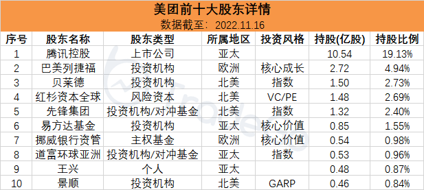 2022年11月25日,中国领先的本地生活服务电商平台美团公布第三季度经营业绩:22Q3营收626.2亿元(YoY+28%),毛利润185.0亿元(YoY+72%),经营性溢利为9.9亿元(YoY+110%),经调整净利润为35.3亿元(YoY+164%)。22Q3美团交易用户数达6.87亿人(YoY+2.9%),活跃商家数达930万(YoY+11.3%),每位交易用户平均每年交易笔数达39.5笔(YoY+14.8%),即时配送交易笔数达到50.25亿(YoY+16.2%)。整体来看,第三季度美团的经营利润扭亏为盈,利润端增长大超预期。利润的提升提升主要是配送服务的收入与成本差额正在逐步缩小,每单亏损大幅改善。外卖用户季度消费频率创历史新高,闪购业务高增,疫情过后到店酒旅有所修复,新业务经营亏损收窄。同时,在降本增效的全年战略支持下,公司整体期间费用率改善显著。虽然交出了一份靓丽的Q3成绩单,但美团另一方面也面临着腾讯“分红式减持”的压力。根据腾讯11月16日发布的公告,腾讯将以实物分派美团股份的方式宣派中期股息。而腾讯南非大股东Naspers网站消息则称,其收到美团股份后将视为持有待售股份。在业绩基本面之外,腾讯的减持动作可能对美团产生何种影响?我们尝试从股东信息中寻找出潜在的股价影响因素。在港股市场近2600家上市公司中,美团市值排名长期保持在前十,截至11月24日美团市值8566亿港元位列第十,且与排名在其前三位的公司市值差距极小;以今年以来的累计成交额计算,美团的累计成交额高达1.2万亿港元,位列港股全市场第二位,活跃度仅次于腾讯。自2018年上市以来,美团一直是港股市场最重要的流动性贡献者之一,今年以来美团的日均成交额近55亿港元,占港股市场日均976亿港元交易量的5.6%。在截至11月24日的恒生科技指数30只成份股中,美团占据7.09%的权重,当日成交额占所有成分股成交额的14.8%。因此,美团的涨跌对于香港科网股甚至整个港股市场都有巨大的影响。今年以来,美团股价累计下跌了38.6%,同期恒生科技指数下跌了37.3%,两者涨跌趋势基本一致。由于美团的大股东便是腾讯,11月16日腾讯在公布三季报的同时,以10:1宣派其持有的9.58亿股美团股份作为特别股息。腾讯的“分红式”减持,可能对美团产生怎样的影响?二、美团的股东结构:海外投资机构占比近8成,成长与价值风格占大多数美团的投资机构有777家,囊括了各类来自亚太、欧洲和北美的顶级投资机构、对冲基金、主权基金、风险资本以及上市公司。前十大股东持仓占比超过37%,其中大股东腾讯持股比例便超过了19%。从地区上看,亚太、欧洲及北美地区的股东数量占美团机构股东总数的37.8%、36.3%及24.3%;其中来自大陆和香港的股东分别有100家和71家,其余606家均来自其他国家/地区,海外机构投资者(不含香港)比例高达78%以上。从投资风格上看,成长、价值以及GARP (价值成长并重)类型的投资者占据美团股东的大多数,这也从侧面反映了投资机构对于美团的看法:兼具成长和价值的优质标的。三、大股东腾讯的“分红式减持”:参照京东,料负面影响可控截至2021年底的数据显示,腾讯持有美团10.54亿股,持股比例达到了19.13%。而继21年底腾讯以分红方式减持京东集团14.7%的股份之后,2022年11月16日,腾讯在公布三季报时再次采用相似的方式,宣布以10:1派发其持有的9.58亿股美团股份作为特别股息。派息减持过后,腾讯持有美团股权的比例将降至2%不到(0.97亿股),美团也不再并表。按照公告当日美团收盘价(162.3港元)计算,此番分红总市值达到1555亿港元(多于去年减持京东的1275亿港元)。本次分发美团股份预计将于明年3月完成。根据腾讯的公告,享有美团股票实物分派权利的腾讯股份于联交所的最后买卖日期预期为2023年1月4日,股份到账日为2023年3月24日左右。也就是说投资者如果想获得美团这笔实物股权,需要在1月4日收盘持有腾讯。消息传出后,美团港股股价次日应声大跌5.73%,但次日又收涨4.84%几乎全部收回。回顾去年底腾讯减持京东的情况,其股价也是在首日出现较大跌幅但后续并无因减持而连续下跌。2022年京东的下跌主要是受到了中概股崩盘影响,但其跌幅及波动率仍显著小于其他中概股,可见腾讯减持的负面影响是可控的,市场亦普遍认为“分红式”减持是目前对标的公司二级市场股价冲击最小的方式。同时美团还有比京东更大的优势——美团是港股通标的,流动性更好。四、Naspers的减持影响:若每日抛售日均成交额的3%,清仓需用时一年除了腾讯自身外,其大股东南非Naspers也是不可忽略的因素。根据Naspers旗下荷兰子公司Prosus的资产净值报表,截至2022年11月24日,其持有腾讯26.137亿股。假如Naspers在1月4日前没有再减持腾讯,则其会接收到2.6亿股美团,成为其第二大股东(假设其他机构持股不变)。今年6月27日,Naspers出售了从腾讯分红所得的近1.32亿京东股份,套现近40亿美元。该公司近期表示,考虑在收到以特别股息发放的美团股份后进行出售,按11月24日收盘价(138.9港元)计算,这笔股份目前总价值超过360亿港元。假设Naspers按照美团今年以来日均成交3257万股规模的3%~5%减持,会给美团带来每日98~163万股,每日抛压约1.4~2.3亿港元,所需时间约160~265个交易日。以此来看,这一减持相对美团的日均成交规模而言压力并不算大。