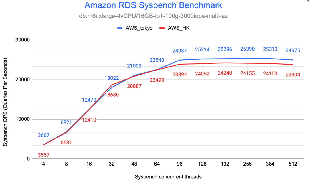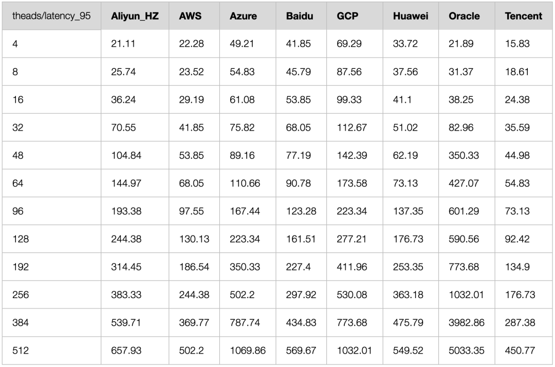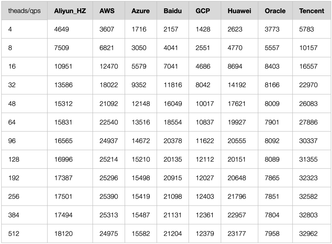 相比于第一次测试,这次AWS表现出了非常好的性能(第二名);这是比较意外的,不过再回头看上次测试中,AWS也表现出了很好的扩展性,可能当时最大128线程并发,并没有压测当时的极限性能。也可以看到,Amazon RDS在高并发的时候,表现是非常好的。