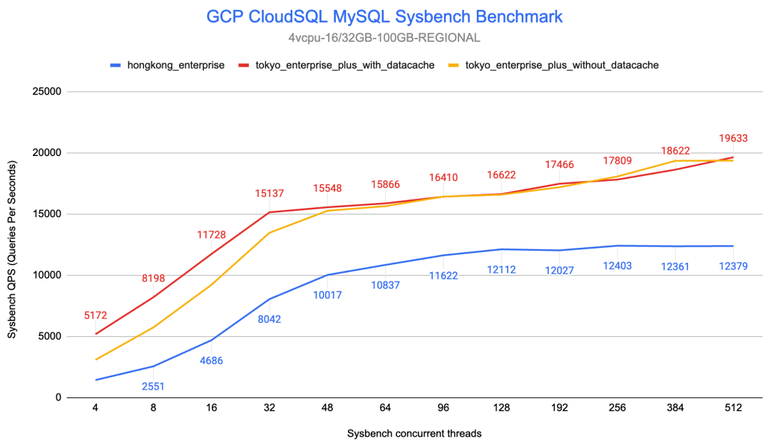 Enterprise Plus版本通过使用更新的机型,以及更高效的存储效率,从而提升数据库的性能。关于两个版本差异可以参考:Google Cloud SQL for MySQL的”Enterprise”和”Enterprise Plus”版本。本次对Enterprise和Enterprise Plus版本进行了一个性能对比,Enterprise Plus版本又分为开启data cache与关闭data cache这个场景: