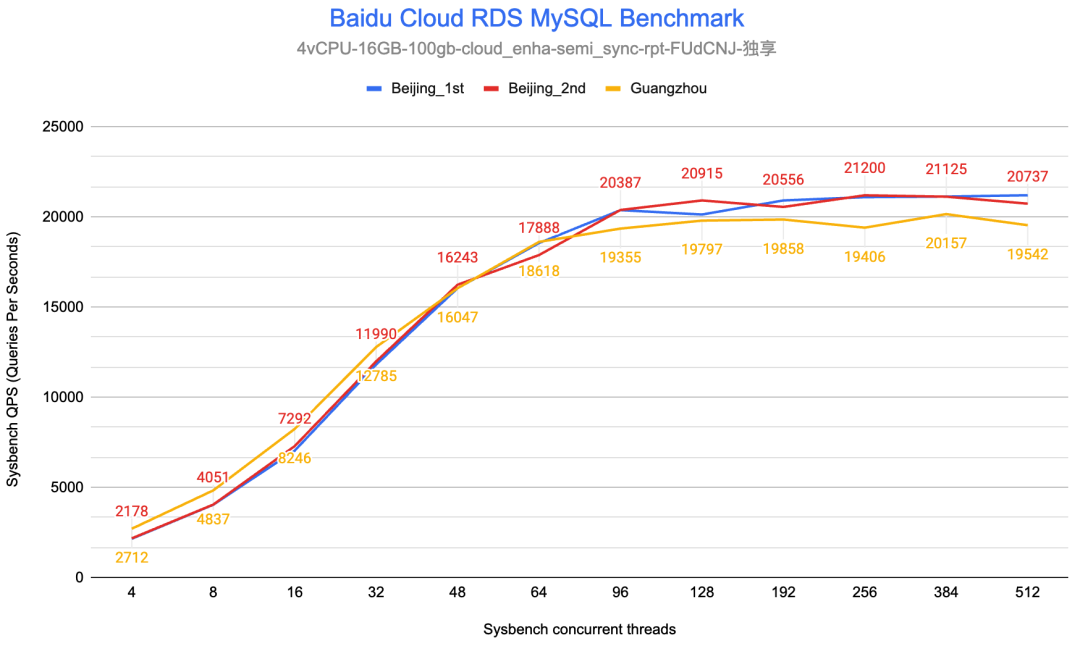 第四名是百度云RDS,其测试结果与华为云非常接近。另外,百度云的测试结果在北京、广州两个区域做了验证,性能表现较为一致。