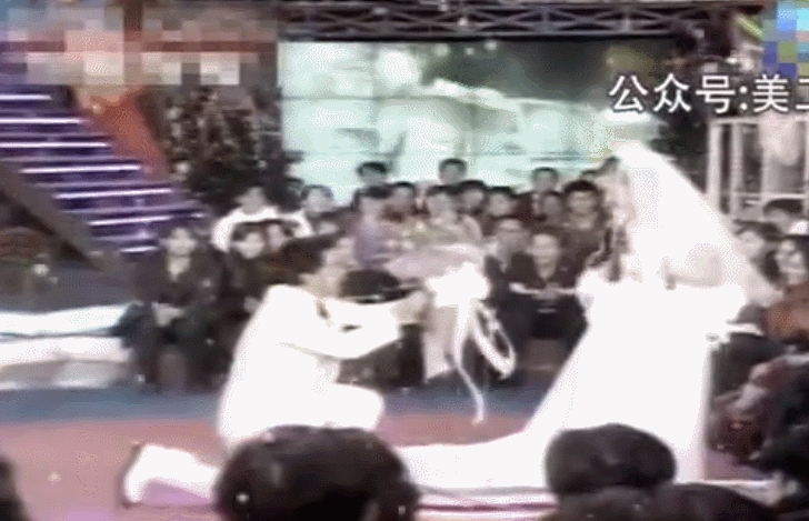 陈孝萱身穿白色婚纱,在工作人员的指引下,缓缓走进《综艺旗舰》的演播厅。