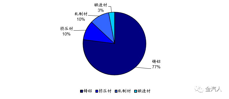 压铸是主要用铝工艺。汽车用铝合金主要包括4种铝材:轧制板材、挤压材、铸造铝合金和锻造材。根据李龙在《铝合金在新能源汽车工业的应用现状及展望》中的介绍,目前各类铝合金在汽车上使用比例大致为:铸铝77%,轧制材10%,挤压材10%,锻压材3%,和我们自己测算比例相当。