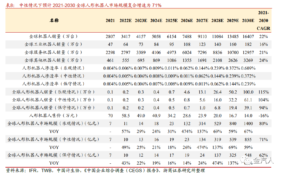 应14万人民币)测算,对应全球市场规模分别约548/855/1400亿元,2021-2030年全球市场规模CAGR分别为62%/71%/80%。
