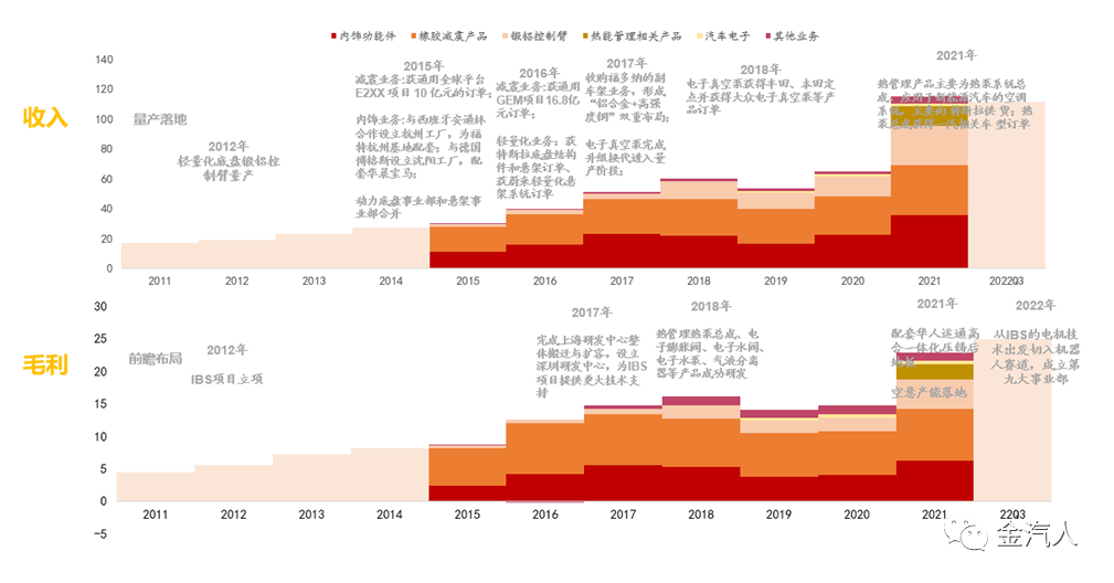 其中公司由结构件向汽车电子部件转型也并不是一帆风顺,公司2012年立项线控制动IBS,直到2022年才成功定点红旗、吉利几款车型,可谓十年磨一剑。但高技术壁垒产品一旦突破,公司很容易拓展业务边界,比如公司依托汽车电子领域的深厚积淀,在智能刹车系统IBS的技术的基础上横向拓展开发出热管理系统,实现第一代产品向A客户的批量供货,并成功研发出第二代产品,可以提供水侧、剂侧独立的部分集成方案。