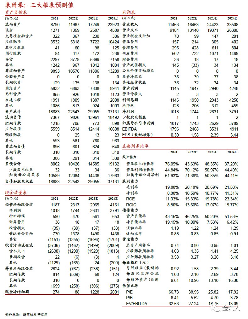 4、热能管理相关产品:新能源车热管理系统单车价值量是燃油车的3倍,所以业务所处行业本身受益新能源车发展。同时公司在最新非公开发行预案中披露新增130万套热管理系统产能,相较于2021年53万套的产量有明显增长,我们预计热管理业务2022-2024年收入增速在20%、80%、60%,毛利率考虑规模效应分别为18%、19%、20%。