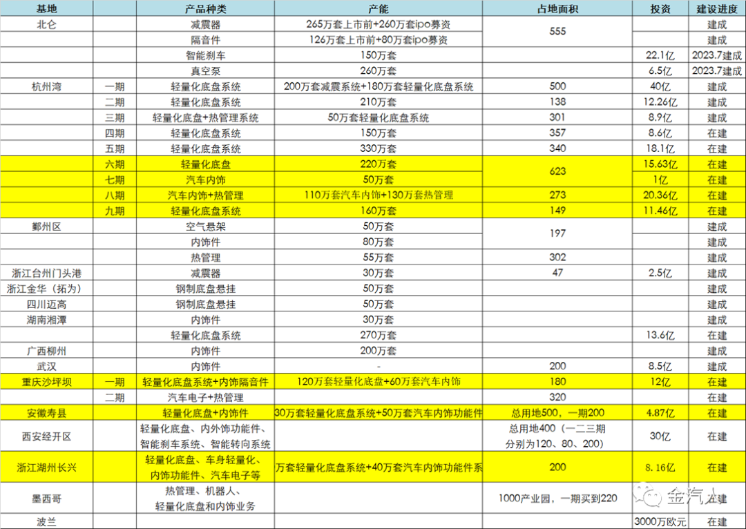 截止目前总体规划:约6160亩地,其中已经明确规划产品种类及产能合计:轻量化底盘系统1800万套,减震系统755万套;内饰件856万套;汽车电子480万套;空气悬架50万套;热管理185万套。其他土地还没有明确产品规划。