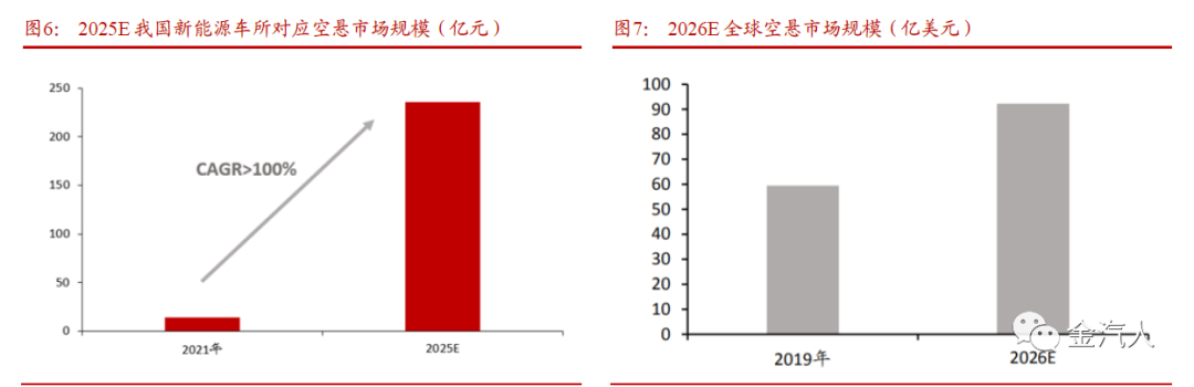 我们认为,在新能源车销量持续高景气的前提下,随着国产化替代方案的落地以及消费者驾乘体验升级的新增需求,空气悬架在终端的渗透率将逐步提升,配置价位将有望下探至25万元,预期2025年国内新能源乘用车对应的空气悬架对应的市场空间将达到235亿元,年化增长率将突破100%。