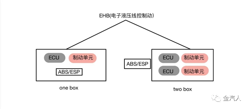 Twobox是一种分立式的方案,EHB与ABS/ESP系统相互独立,含有两个ECU,两个制动单元。Twobox可以实现L3以上高级别智能驾驶对于安全冗余的要求。但Twobox的方案有两个缺点,一是分为两个模块之后,重量和占据空间比较大,二是成本相比Onebox较高。
