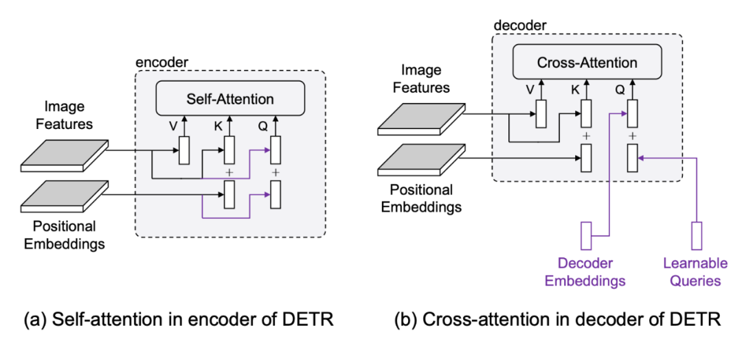 可以看到,encoder 和 decoder 里 attention 和 query 和 key 都是由两部分组成的,比如 encoder 里的 query 分别来自于图像特征(包含语义信息)和位置编码(包含位置信息),因此这两部分分别称为 content query(对应图像特征)和 positional query(对应位置编码)。key 和 query 完全相同。value 只有图像特征这一语义部分。