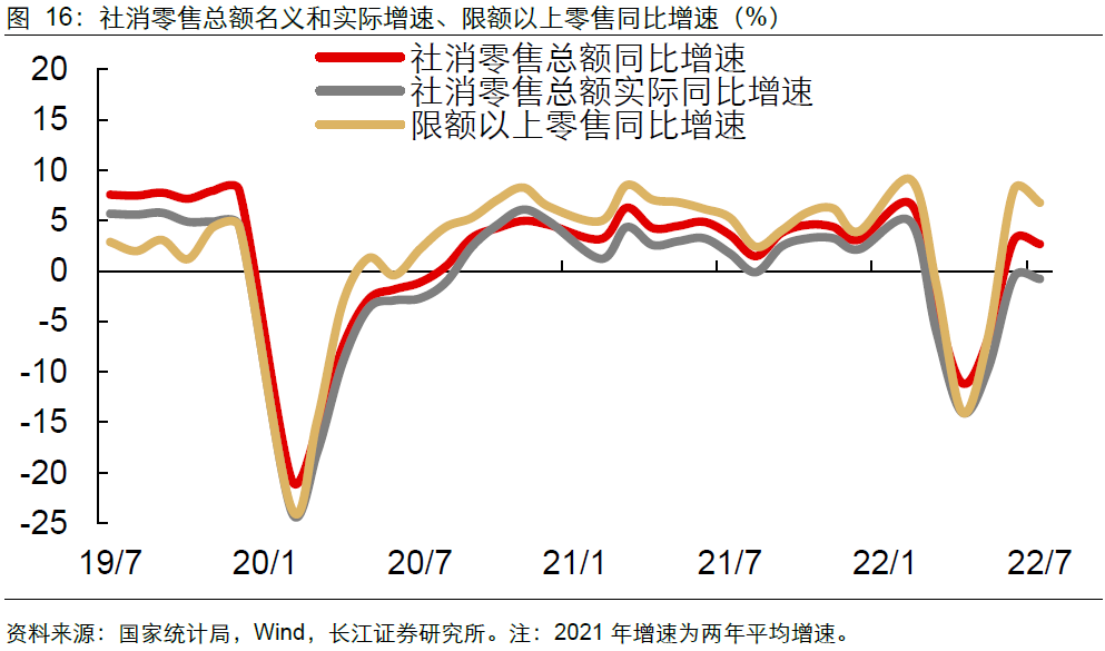 7月消费整体走弱趋势明显。7月社消零售及限额以上零售同比增速分别回落至2.7%、6.8%,较前月分别下降0.4pct、1.3pct,降幅较为显著。其中,限额以上零售仍显著大于社零整体增速,反映消费领域小微主体恢复仍不理想。此外,从实际增速看,7月社零实际同比下降0.8%,降幅再度扩大,反映消费整体呈现走弱趋势。![]()