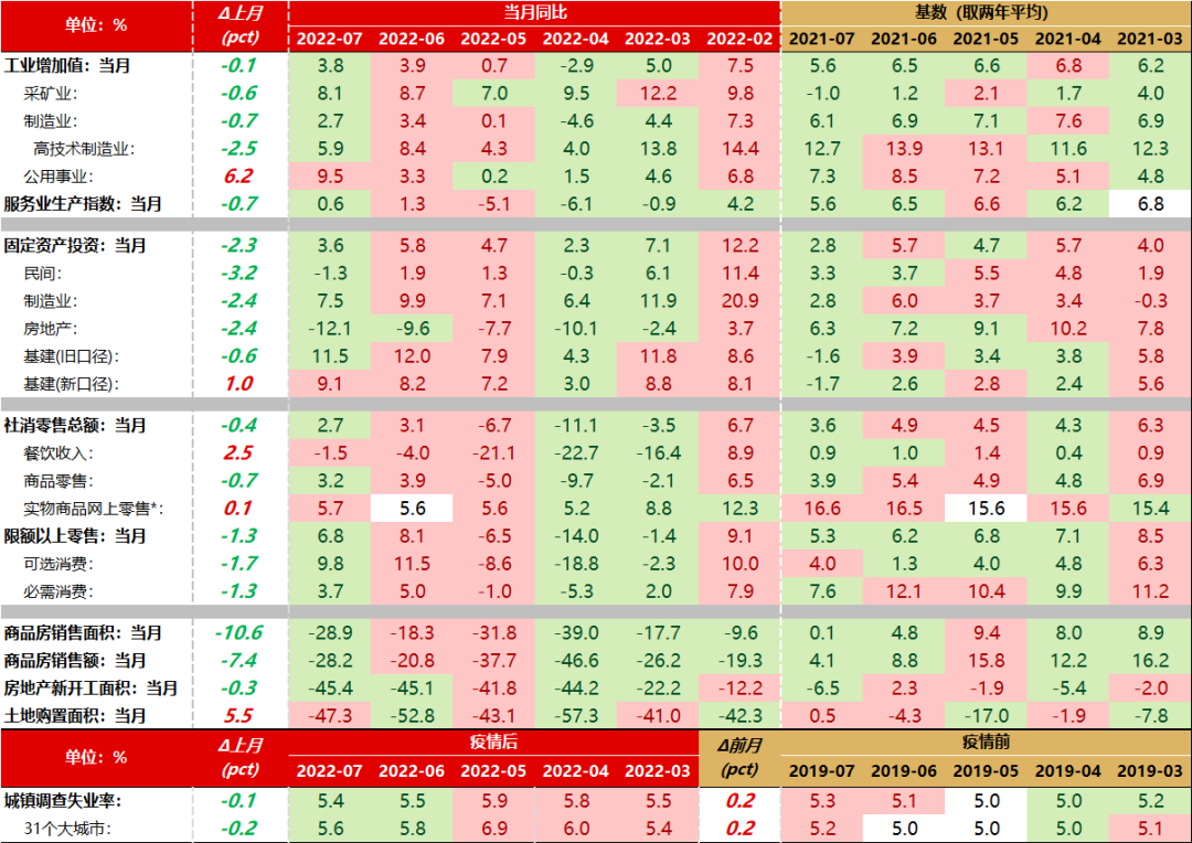 l 生产蛰伏下行,汽车一枝独秀。7月工业增加值同比增速回落0.1pct至3.8%,服务业生产指数同比增速同步回落到0.6%。三大门类中,仅有公用事业因晴热天气增速回升,采矿业、制造业增加值同比增速双双回落。生产复苏仅在第三个月即遭遇挫折。从分行业数据来看,仅有汽车行业及其他运输装备行业同比增速较上月抬升。其中,汽车行业增加值同比增长22.5%,更是一枝独秀。然而其余行业增加值同比增速均较上月不同程度回落。工业生产转弱趋势明显。l 投资仅有基建支撑,制造业、地产投资双双转弱。估算7月固定资产投资同比增速回落至3.6%。其中,7月民间投资同比增速由正转负至-1.3%,增速甚至低于4月低点。从三大分项来看,基建独自支撑、制造业增速回落、地产降幅扩大。基建方面,估算新口径基建同比增速续升至9.1%,而旧口径基建同比增速回落至11.5%,主要缘于7月交通、水利类增速走强而电力投资同比增速走弱。制造业方面,估算7月制造业投资同比增速回落至7.5%,分行业来看,新兴行业投资增速边际改善,而通用设备、其他运输装备两行业投资增速下滑较为明显。地产方面,估算7月地产投资同比降幅扩大至6.4%。同期低基数未能承托地产转好,地产销售降幅再度扩大,新开工面积同比降幅扩大。土地购置、施工及竣工数据虽有边际改善,但降幅仍大。l 社零整体走弱,分化再度显现。7月社消零售及限额以上零售同比增速分别回落至2.7%、6.8%,指向消费整体边际走弱。而从结构来看,主要有三个方向的分化:一是餐饮、零售表现分化,餐饮收入降幅缩小至1.5%,商品零售同比增速回落至3.2%。二是线上线下零售表现分化,实物商品网上零售增速反弹,而线下商品零售相对转弱。三是金银珠宝同比表现一枝独秀,其余品类商品零售增速大多走弱,反映居民或出现避险情绪。l 就业整体转好,但青年失业隐忧仍在。7月城镇调查失业率、31大中城市调查失业率继续回落0.1pct、0.2pct,主要缘于外来务工群体就业边际转好。7月25-59岁人口调查失业率下探0.2pct至4.3%,外来户籍人口调查失业率下探0.3pct至5.5%。相比之下,青年失业率再度走高至19.9%,属于季节性回升。向前看,青年失业率或在8月季节性回落,但难改青年就业压力仍大的客观现实。l 短期寻找韧性,长期亟待提振信心。7月经济数据与PMI数据相互印证,证明经济短期遭遇挫折,供需两端同时出现边际走弱迹象。但除了短期变化,经济数据中所呈现的长期趋势更值得关注,主要是微观主体预期转弱已在基本面逐步兑现。企业端,民间投资增速由正转负,且同比增速低于4月低点,这与社融数据中企业中长贷的数据相互印证,反映企业投资意愿偏弱正在制约企业资本开支。居民端,消费整体转弱过程中,金银珠宝零售增速逆势高增,与M0增速逆势高增相印证,反映居民出现避险需求。短期变化叠加长期趋势,使得经济不得不回到重新寻找韧性的道路上。而从政策端来看,8月15日央行调降MLF利率或是政策主动承托需求的起点。但想要扭转微观主体的悲观预期,或许需要更及时、更强有力、更有系统性效力的政策。而从中长期来看,除了应对短期问题,市场主体同样期待政策端有所作为,增添市场主体对于中长期经济增长的信心。