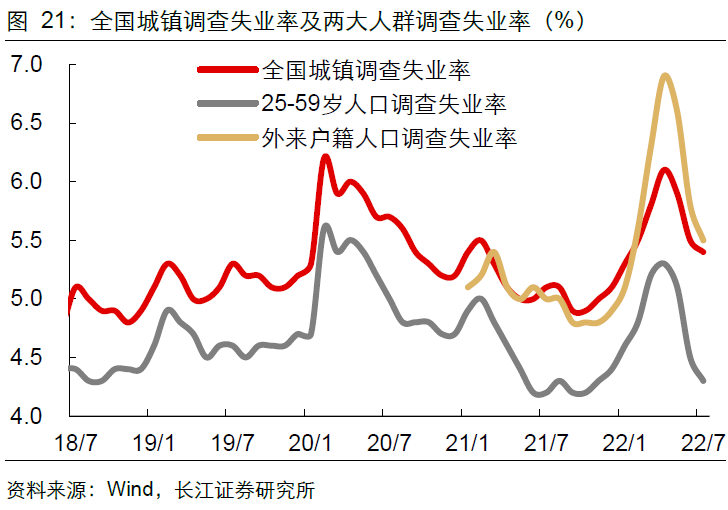 城镇调查失业率持续回落。7月城镇调查失业率、31大中城市调查失业率继续回落0.1pct、0.2pct,主要缘于外来务工群体就业边际转好。7月25-59岁人口调查失业率下探0.2pct至4.3%,外来户籍人口调查失业率下探0.3pct至5.5%。相比之下,青年失业率再度走高至19.9%,属于季节性回升。向前看,青年失业率或在8月季节性回落,但难改青年就业压力仍大的客观现实。![]()