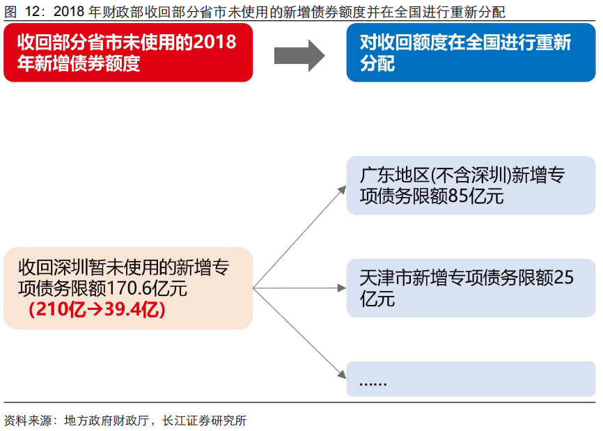 在限额空间分布不均衡的情况下,是否能够进行跨省调配呢?从可行性来看,历史上限额空间曾进行跨省调配。从历史经验来看,主要可以分为对“当年新增债务限额”和“存量债务限额空间”进行重分配这两种情形。情形一:跨省市重新分配当年新增债务限额,但使用上限为当年未使用的额度。2018年12月,为加快专项债券发行和使用,财政部收回了部分省市未发行使用的2018年新增债券额度,并对收回额度在全国进行重新分配。我们来看一些案例:财政部收回深圳市暂未使用的2018年新增专项债务限额170.6亿元,并将其重新分配,其中广东地区(不含深圳)、天津市相应调增新增专项债务限额85、25亿元。进一步地,我们来看收回深圳额度的相对规模情况。2018年初,财政部下达深圳新增专项债务限额210亿,收回额度占当年下达限额的81%,主要系2017年末深圳市专项债务限额仅有31.5亿,2018年新增专项债务限额上升较快,导致发行不及预期,故财政部收回部分未发行限额。![]()