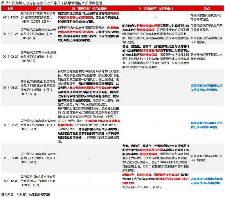 历史上限额空间的使用方式,与限额空间的产生原因息息相关。当下的市场关心的焦点在于限额空间能够使用多少,政策上是否有限制?我们不妨先梳理历史上限额空间的使用情况,进而对后续专项债限额空间的使用进行分析。我们发现,历史上限额空间的使用方式,与上文分析限额空间产生的两种原因息息相关。我们详细梳理了关于限额空间使用的政策文件,对限额空间的使用管理经历了三个阶段:(1)2015-2016年,限额空间主要用于置换存量债务,原因在于当时限额空间的产生也主要来自于核减存量债务。2015-2016年,该时期地方政府主要以发行置换债券为主,对于通过政府和社会资本合作等方式减少政府债务余额所腾出的限额空间,可在置换债券发行规模的上限内优先用于存量政府债务的置换。![]()