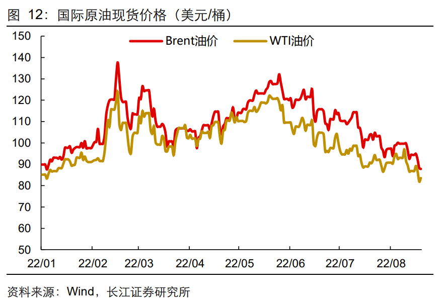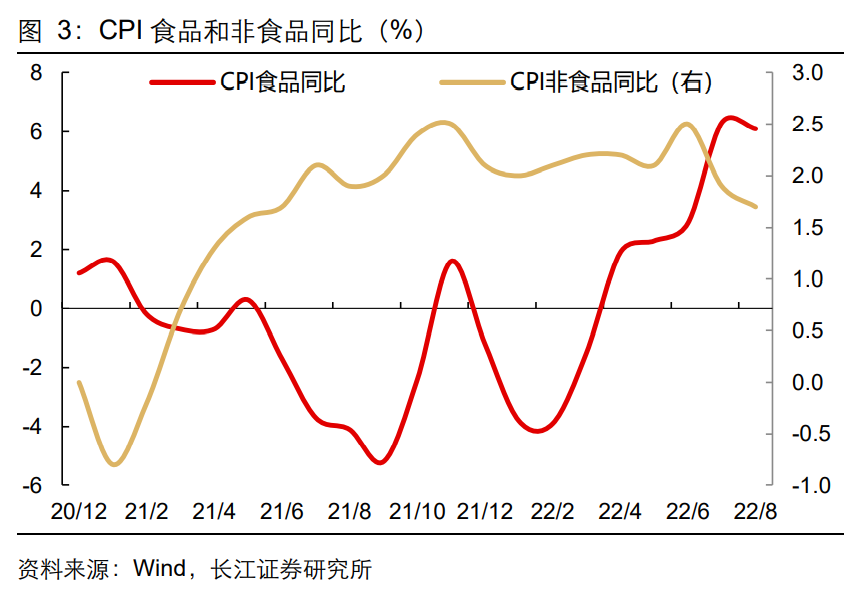 2、从结构上来看,生猪供应在政策引导下逐步恢复、国际原油价格持续下行,带动食品和能源价格回落,同时,地产相关需求持续偏弱、疫情散发压制出行需求,导致工业消费品和服务价格均较上月有所下降。