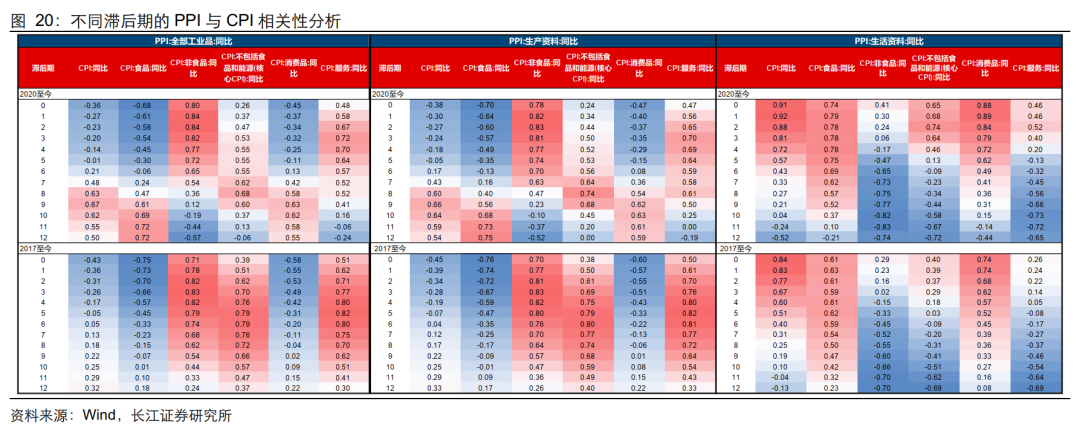 从PPI不同滞后期与CPI的相关性来看,PPI对CPI的传导在8-12月的滞后期逐步显现。
