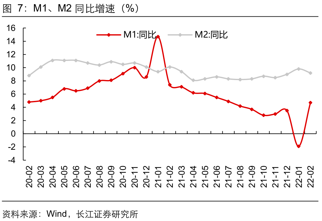月M2同比增速回落至9.2%,从结构上看,居民存款同比多减3.55万亿,以及财政存款同比多增1.45万亿,后者主要系基数和税收上缴影响,一定程度上也指向2月春节期间财政发力变弱。而M1则回升6.6个百分点至4.7%,且企业存款同比多增2.56万亿,M1、M2增速之差亦缩窄至-4.5%,指向当前一系列稳增长政策推动下企业经营活力有所改善。