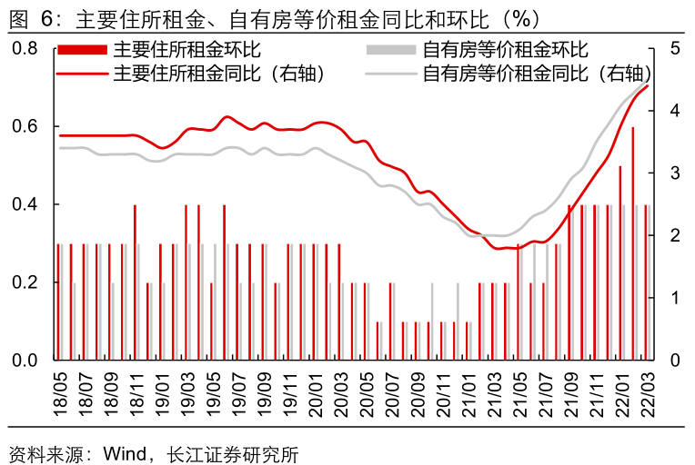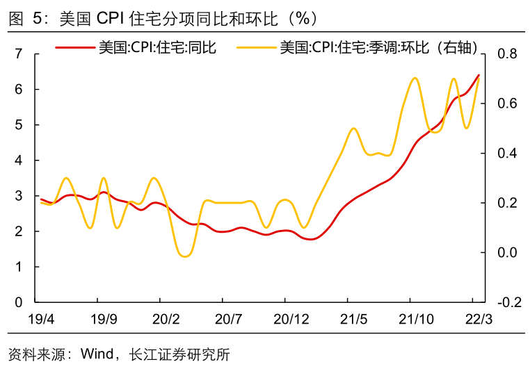 前期房地产价格上涨的影响仍在持续演绎,美国自有房等价租金同比涨幅扩大至4.5%,创下2007年5月以来新高,仍在持续推高美国通胀水平。