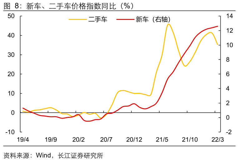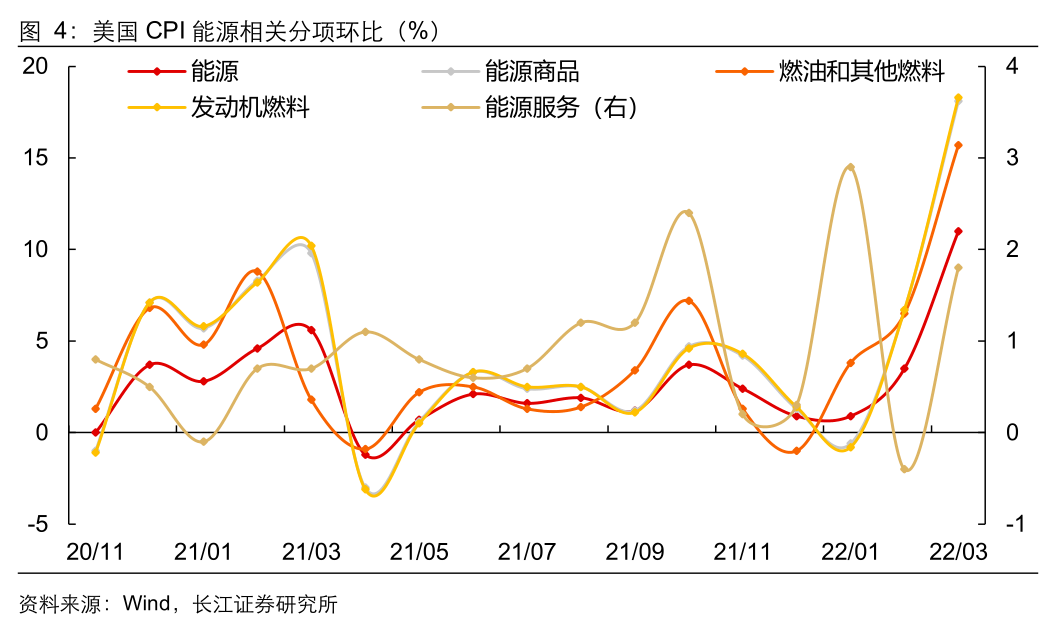 2、分项上看,1)油价大幅攀升推升能源商品价格;2)房地产价格上涨的影响仍在持续演绎,租金持续上涨,住宅分项抬升;3)但前期领涨分项二手车供需缺口反转,价格已开始大幅回落。