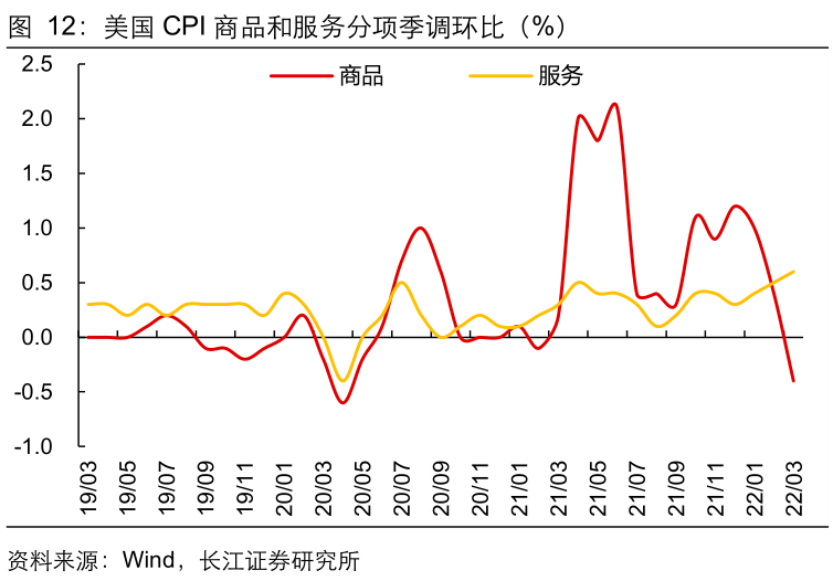 2)核心CPI季调环比连续两个月回落且低于预期,尤其是商品分项环比回落转负,意味着核心通胀拐点初见端倪,但非耐用品价格环比大幅走高、租金价格持续上行仍然值得警惕,也预示着距离核心CPI同比见顶仍有时日,下半年或可期待,届时美联储加息力度将有望明显放缓。
