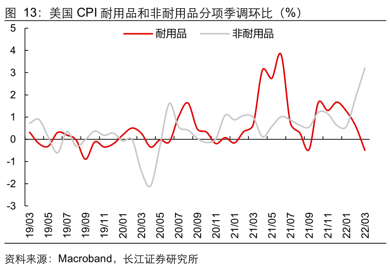 2)需求由商品转向服务,核心通胀拐点初见端倪,但非耐用品价格环比大幅走高、租金价格持续上行仍然值得警惕,核心CPI同比见顶或在下半年,届时美联储加息力度将有望明显放缓。