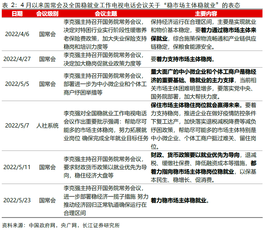 二是,在近期关键会议上,李克强总理多次强调稳市场主体和稳就业工作的关系。4月以来,7次国常会中共有5次提及就业问题,而在政策表态和定调上,稳市场主体始终与稳就业、稳岗等关键词“同框”出现。