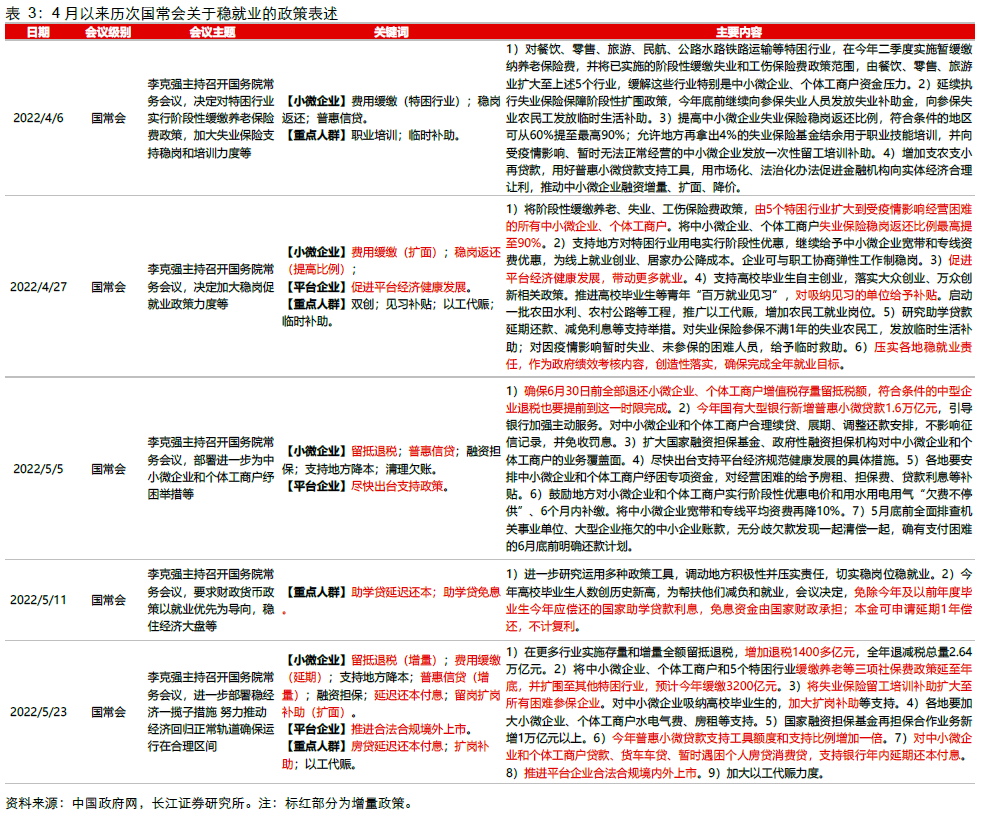 三是,从4月以来国常会的具体部署来看,支持小微主体和平台经济是“稳市场主体稳就业”政策的主要发力方向。我们梳理了4月以来历次国常会关于稳就业的具体政策举措,大致可分为1)稳市场主体、2)保重点人群两个方向,针对前者的政策更多,力度更大。而在“稳市场主体稳就业”方向上,小微主体和平台经济是两大抓手,政策供给较为充足,也始终在不断迭代。