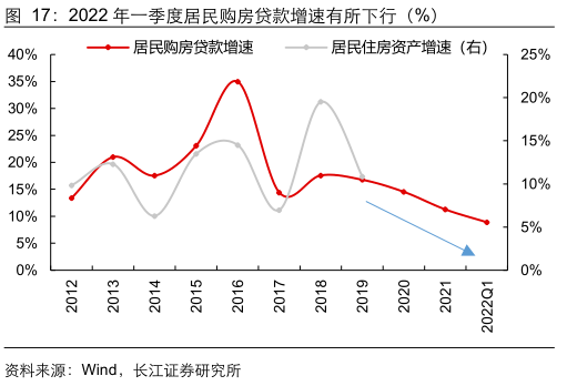 2022年一季度居民购房贷款占比和同比增速均有回落。不难发现,历史上居民购房贷款占比、增速,与居民资产占比、增速的趋势较为一致。而从2022年一季度最新的居民购房贷款数据来看,占比回落至53.7%,同比增速自2018年之后持续回落,2022年Q1为9%,预计居民住房资产占比和同比增速亦有一定回落。与2013-2015年对比来看,虽然目前购房贷款占比高于2013-2015年,但增速较低。