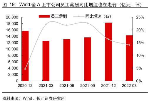从收入视角来看,城镇居民人均可支配收入当季同比增速尚未修复至疫情前水平,而处境相对较好的上市公司员工薪酬同比增速也连续两个季度走弱。
