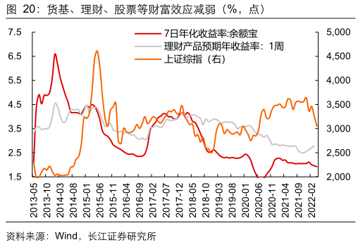 然而,当下居民资产负债情况和收入收益情况或比2013-2015年更为严重。从居民资产负债的视角来看,2022年一季度居民购房贷款占比和增速均有回落,与2013-2015年对比来看,虽然目前购房贷款占比高于2013-2015年,但增速较低。从居民收入收益的视角来看,居民可支配收入增速和当下理财预期收益率均低于2013-2014年。