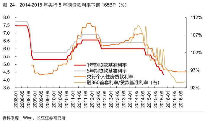 1、首先,最为直接的是通过降息带动个人住房贷款利率下行。2014-2015年,央行进行6次降息,其中5年期贷款基准利率累计下调165BP,2015年末个人住房贷款利率已从2014年7月的高点6.96%回落226BP至4.7%。