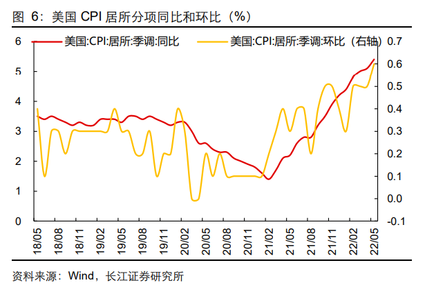。作为CPI中权重最高的分项,5月美国居所价格环比续升0.6%,拉动CPI环比上涨0.19个百分点,显著推升了美国的通胀水平。