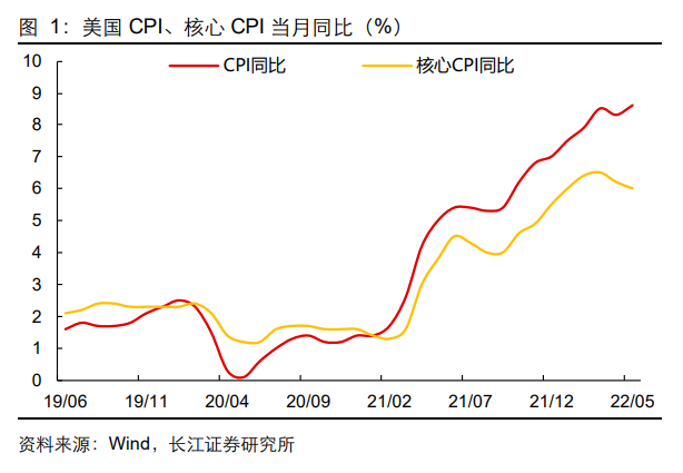 1、5月美国CPI同比突破前高录得8.6%,再创近40年新高;核心CPI同比增速在基数影响下小幅回落,但仍高于预期。
