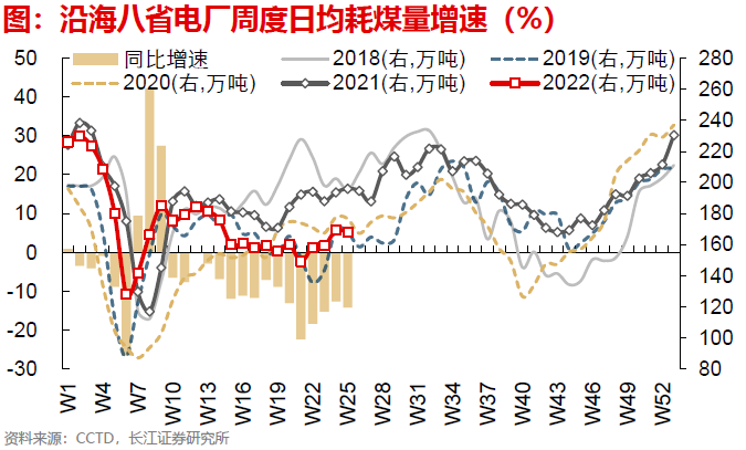 电力:上周发电耗煤降幅扩大,水电出力环比持平。伴随基数抬升,上周三峡水库出库量同比增速回落至29.9%,但从环比来看,水电出力基本持平。火力发电同比、环比增速双双走弱,反映终端用电需求并未明显转好。综合来看,6月以来,全国发电量增速或只是小个位数增长,复产节奏依然偏慢。但随着全国气温逐步升高、复工达产逐步推进,电力系统迎峰度夏压力或逐周升高。