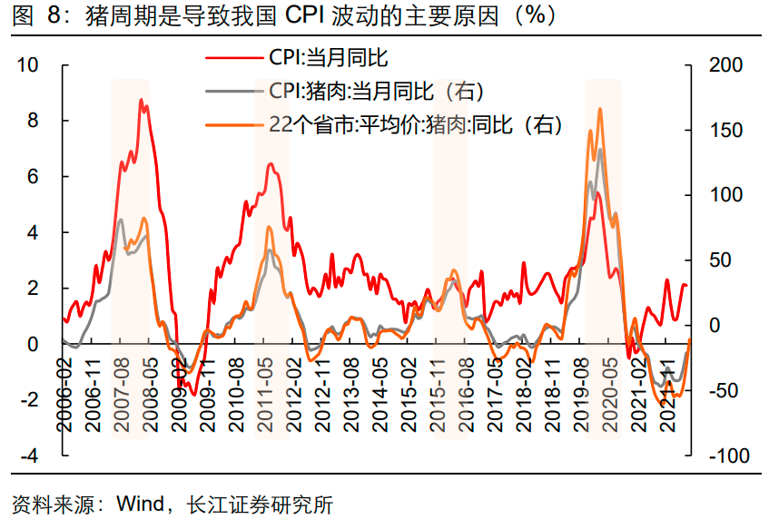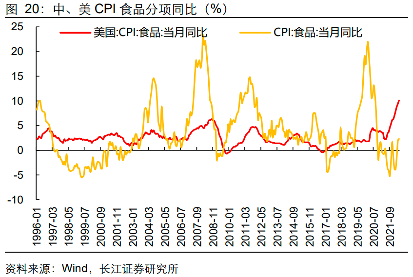 从结构上看,过去猪周期是导致我国CPI波动较大的主要原因,但本轮影响相对有限。从猪价与CPI走势的相关性来看,猪价变化是引起我国CPI波动的主要原因。过去几轮我国CPI水平的大幅走高均伴随着猪价的快速攀升,如CPI分别在2011年7月、2016年4月、2020年1月达到高点,其对应猪肉贡献率分别达到23%、32%、51%。2021年以来猪价进入下行通道,猪肉对CPI同比拉动贡献保持为负,是本轮我国通胀上行相对温和的主要原因。![]()
