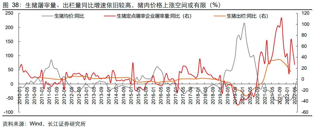 总的来说,大宗商品需求或将在海外货币环境收紧的背景下趋缓,而OPEC增产、美国页岩油生产修复意味着原油供给有望增加,产需缺口有望收敛,原油价格或将持续回落。综合来看,下半年能源价格对我国通胀影响不大,但或需要警惕大豆涨价对我国粮食价格的冲击。对于国内因素,我们将主要从生产资料价格、猪肉价格两方面分析后续面临的通胀风险。对于生产资料价格而言,我们认为在国家保供稳价政策的指导下,其供给端或难以再现2021年的大幅收缩景象。2021年(尤其是上半年)在“碳中和”、“能耗双控”、“限电限产”等因素影响下,煤炭、钢铁等黑色系商品供给端大幅收缩,引发其价格快速上涨,是2021年PPI大幅走高的主要原因。后在监管部门系列“纠偏”、“降温”等保供稳价政策指导下,其供不应求的紧张局面才有所缓解,价格也相应得到回落。2022年在保供政策的指导下,其供给端再次大幅收缩的概率较小。此外在经济下行压力较大背景下,生产资料的需求端表现仍较为疲弱。具体表现为:1)从宏观层面来看,2022年以来房地产业与基建的合计投资完成额当月同比增速仍表现为下行趋势,距疫情前的增速水平仍有较大差距;2)从中观层面来看,钢铁、水泥、化工、煤炭等生产资料的现实需求表现尚未恢复至疫情前水平,价格仍处于较低水平。因此,我们认为下半年生产资料商品价格上涨乏力,不会对通胀构成上行压力。![]()