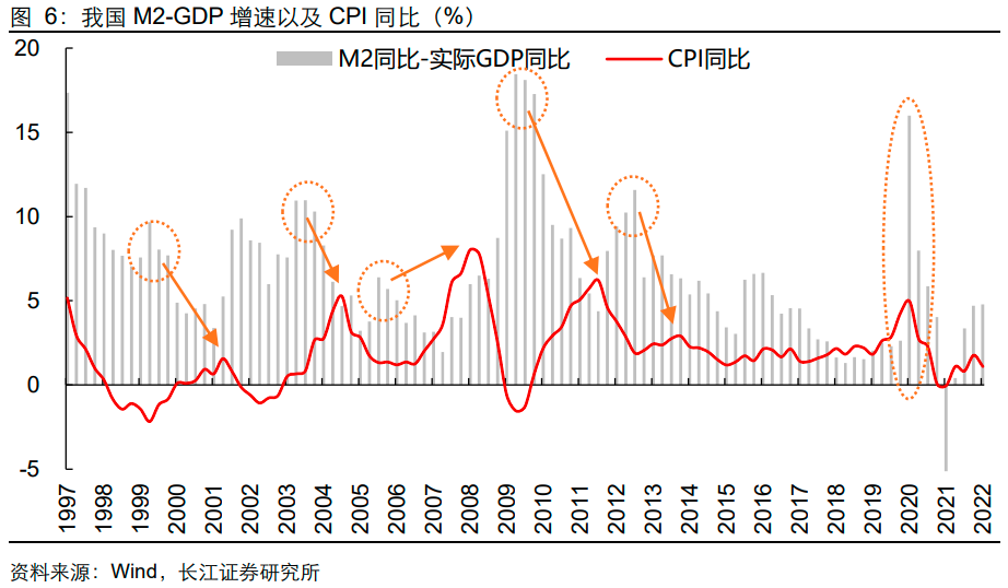 货币超发为我国通胀大幅上行创造了条件。根据货币数量论,货币与通胀之间符合传统费雪方程式中构建的关系,即MV