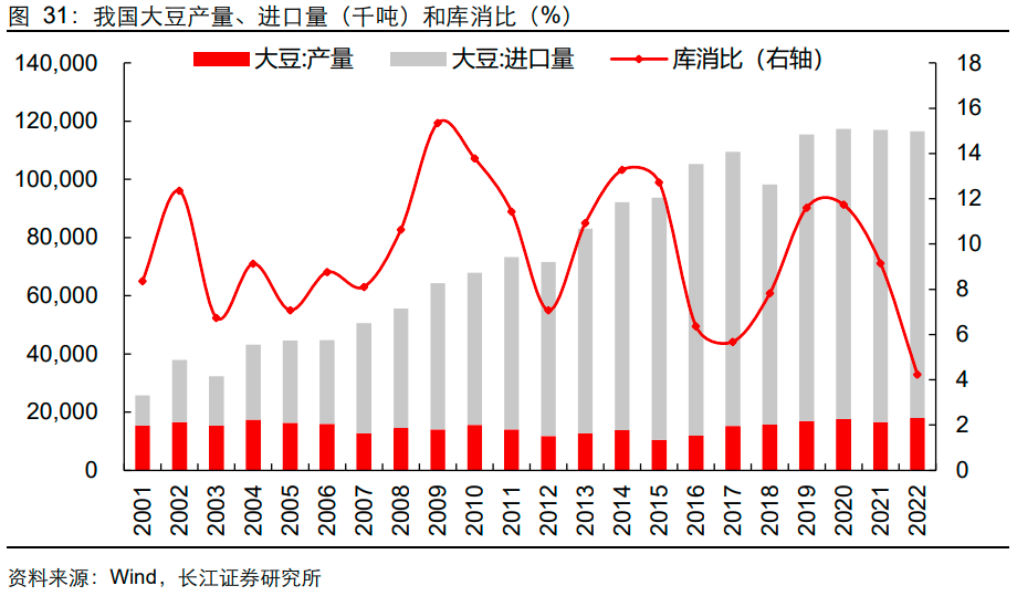 我国大豆主要依赖进口,南美旱情严重导致产量缩减,大豆仍有涨价压力。受拉尼娜气候影响,2021年12月以来南美遭受严重的旱情,作为除美国外的前两大出口国,巴西与阿根廷大豆产量持续下调,使得2021/2022年度全球大豆产需缺口扩大至1300万吨左右,库消比也降至2013/2014年度以来最低。尽管我国本土大豆产量较2021年小幅增加,但增加幅度有限,2022年我国大豆库消比也降至历史低位,意味着大豆的供给仍然偏紧。综合来看,大豆仍有涨价压力。![]()